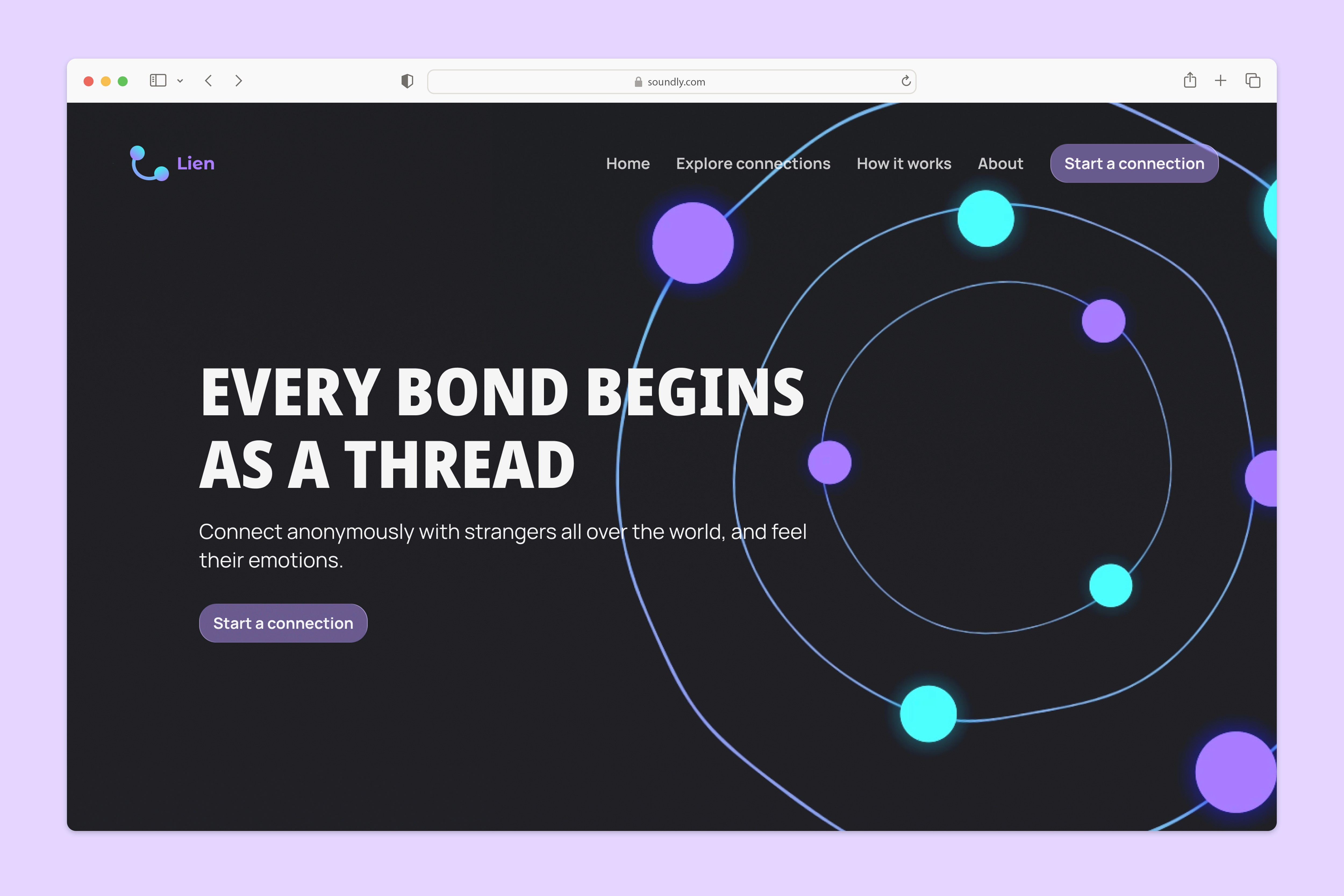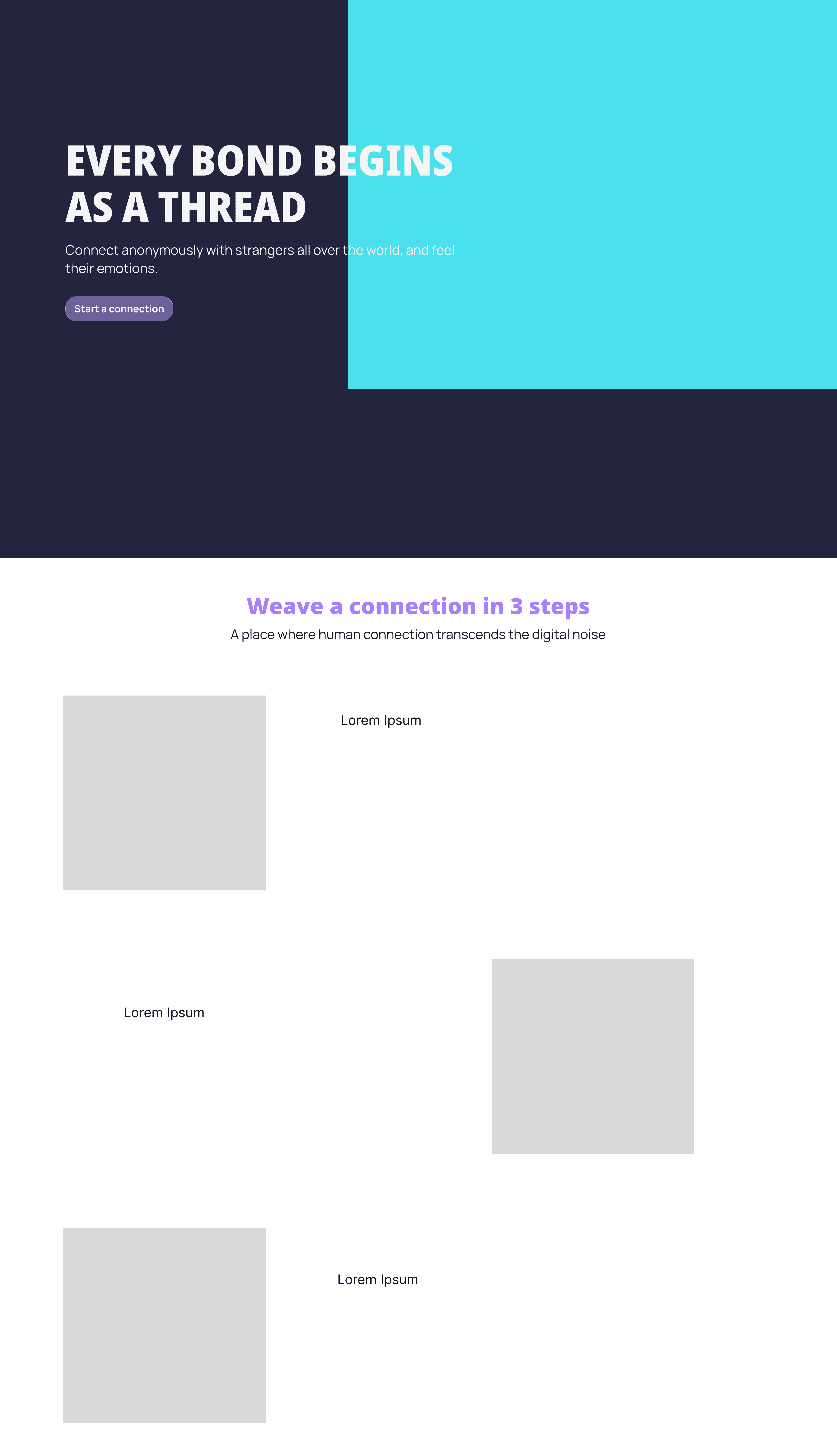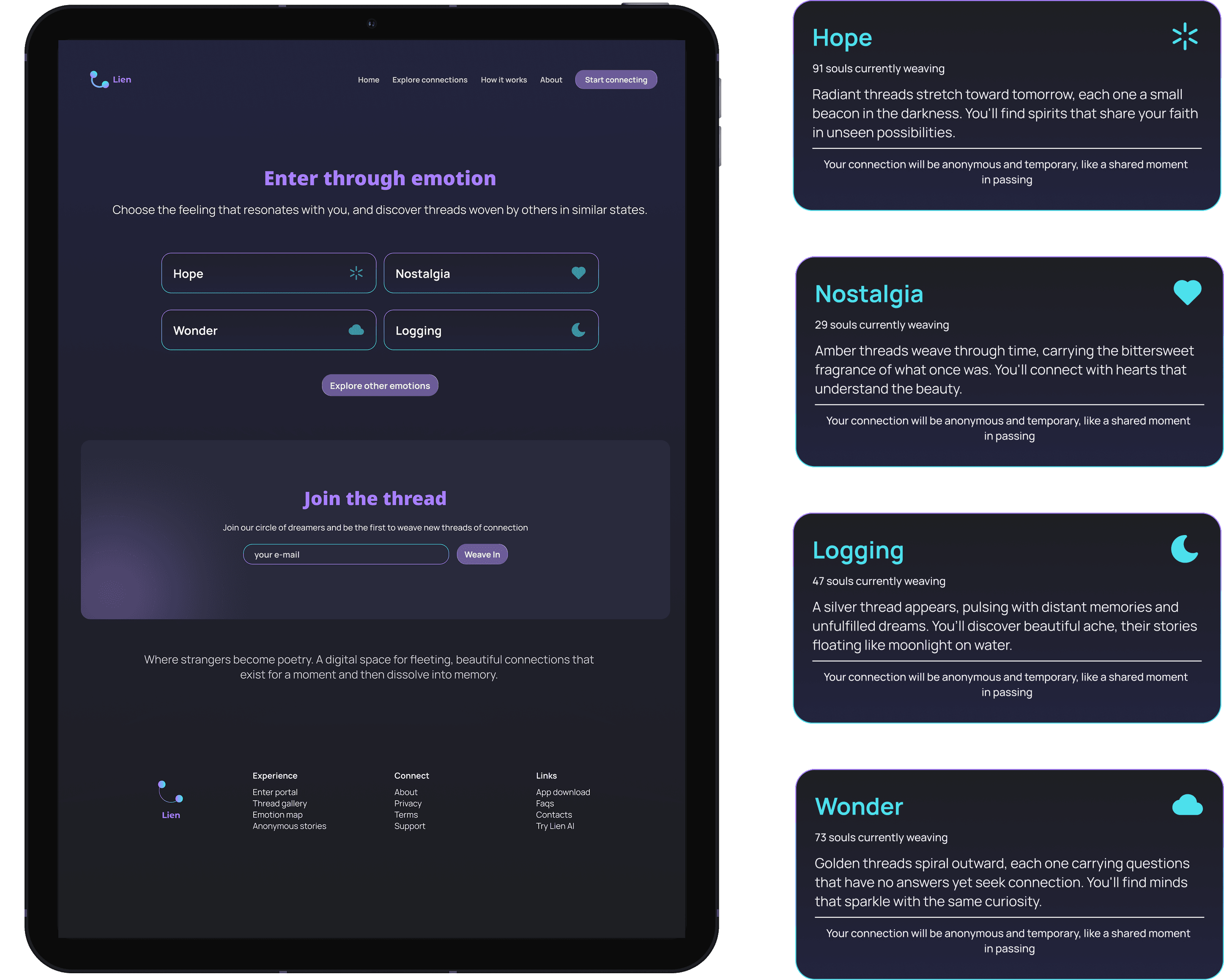 Guides the user in 3 simple steps: choose an emotion, connect with a stranger, create a shared “thread.”